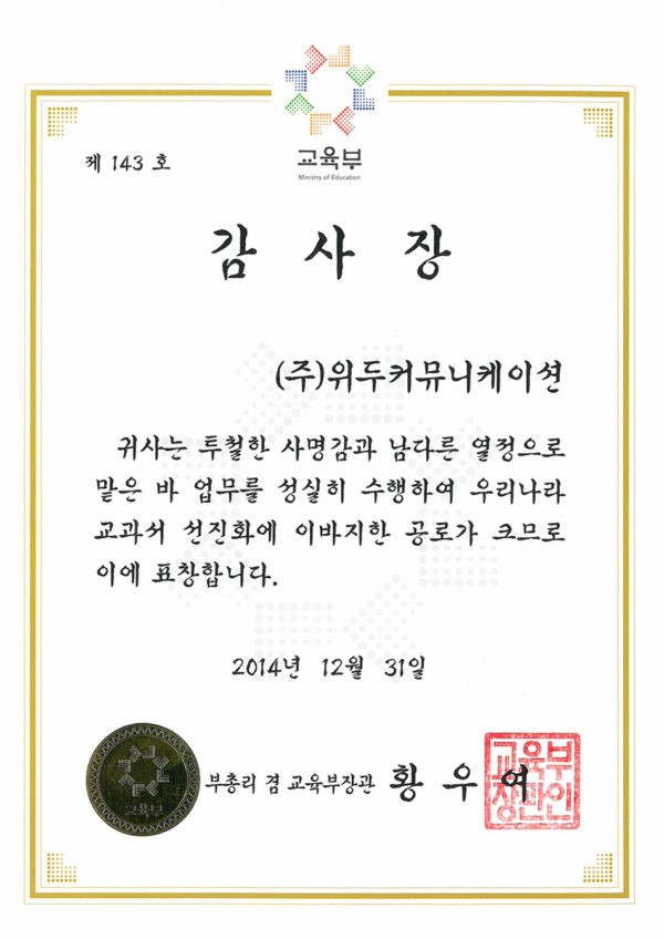 감사장 제 143호 페이지 정보 작성자 WeDu 댓글 0건 조회 5,450회 작성일 19-05-30 19:33 본문 2014-12-31 감사장 제 143호 교과서 선진화 부총리 겸 교육부장관 황우여 List Previous산업통상자원부 표창장 19.05.30 Next한국여성벤처협회 표창장 19.05.30