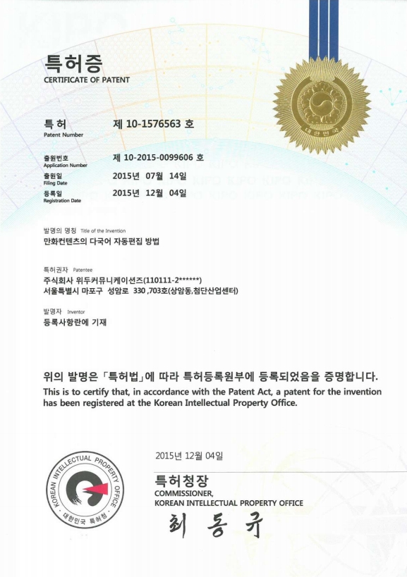 [한국/특허] 만화 컨텐츠의 다국어 자동 편집 방법 페이지 정보 작성자 WeDu 댓글 0건 조회 5,803회 작성일 19-05-30 18:49 본문 2015-07-14 특허 10-2015-0099606 만화 컨텐츠의 다국어 자동 편집 방법 List Previous[한국/특허] 전자서적과 연동되는 게임의 제공 장치 19.05.30