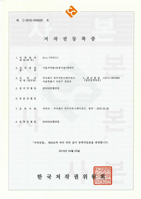 [한국/저작권] 아리스 페이지 정보 작성자 WeDu 댓글 0건 조회 5,725회 작성일 19-05-30 19:09 본문 2016-04-22 저작권 C-2016-009839 아리스 / 미술저작물>응용미술>캐릭터 List Previous[한국/저작권] 필립 19.05.30 Next[한국/저작권] 리안 19.05.30
