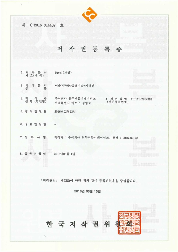 [한국/저작권] 파벨 페이지 정보 작성자 WeDu 댓글 0건 조회 5,548회 작성일 19-05-30 19:11 본문 2016-06-15 저작권 C-2016-014402 파벨 / 미술저작물>응용미술>캐릭터 List Previous[한국/저작권] 누미 19.05.30 Next[한국/저작권] 월터 19.05.30