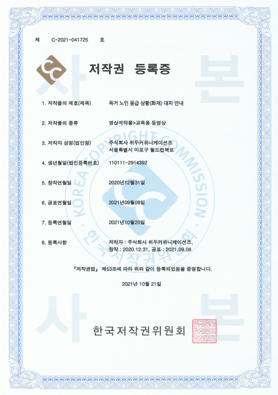 [한국/저작권] 독거 노인 응급 상황(화재) 대피 안내 페이지 정보 작성자 WeDu 댓글 0건 조회 5,802회 작성일 21-12-31 12:41 본문 2021-10-21 저작권 C-2021-041725 영상저작물>교육용 동영상 List Previous[한국/저작권] 장보기 인지훈련 게임 21.12.31 Next[한국/저작권] OLL KIDS/MATH 21.12.31