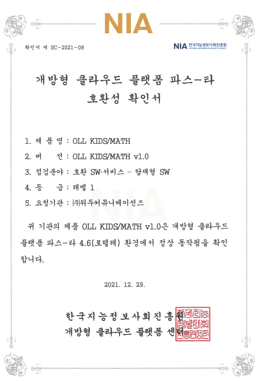 [한국/확인서] OLL KIDS/MATH 파스-타 호환성 확인서 페이지 정보 작성자 WeDu 댓글 0건 조회 9,157회 작성일 21-12-31 12:48 본문 2021-12-29 확인서 제 SC-2021-09 점검분야 : 호환 SW서비스 - 탑재형 SW List Next[한국/인증서] OLL KIDS/MATH 클라우드 서비스 확인서 21.12.31