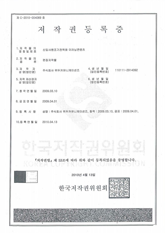 [한국/저작권] 신입사원조기전력화 이러닝 콘텐츠 페이지 정보 작성자 WeDu 댓글 0건 조회 5,552회 작성일 19-05-30 19:01 본문 2010-04-13 저작권 C-2010-004069 신입사원조기전력화 이러닝콘텐츠 / 편집저작물 List Previous[한국/저작권] 리안의 수학 모험 19.05.30 Next[한국/상표] OLL 41류 19.05.30